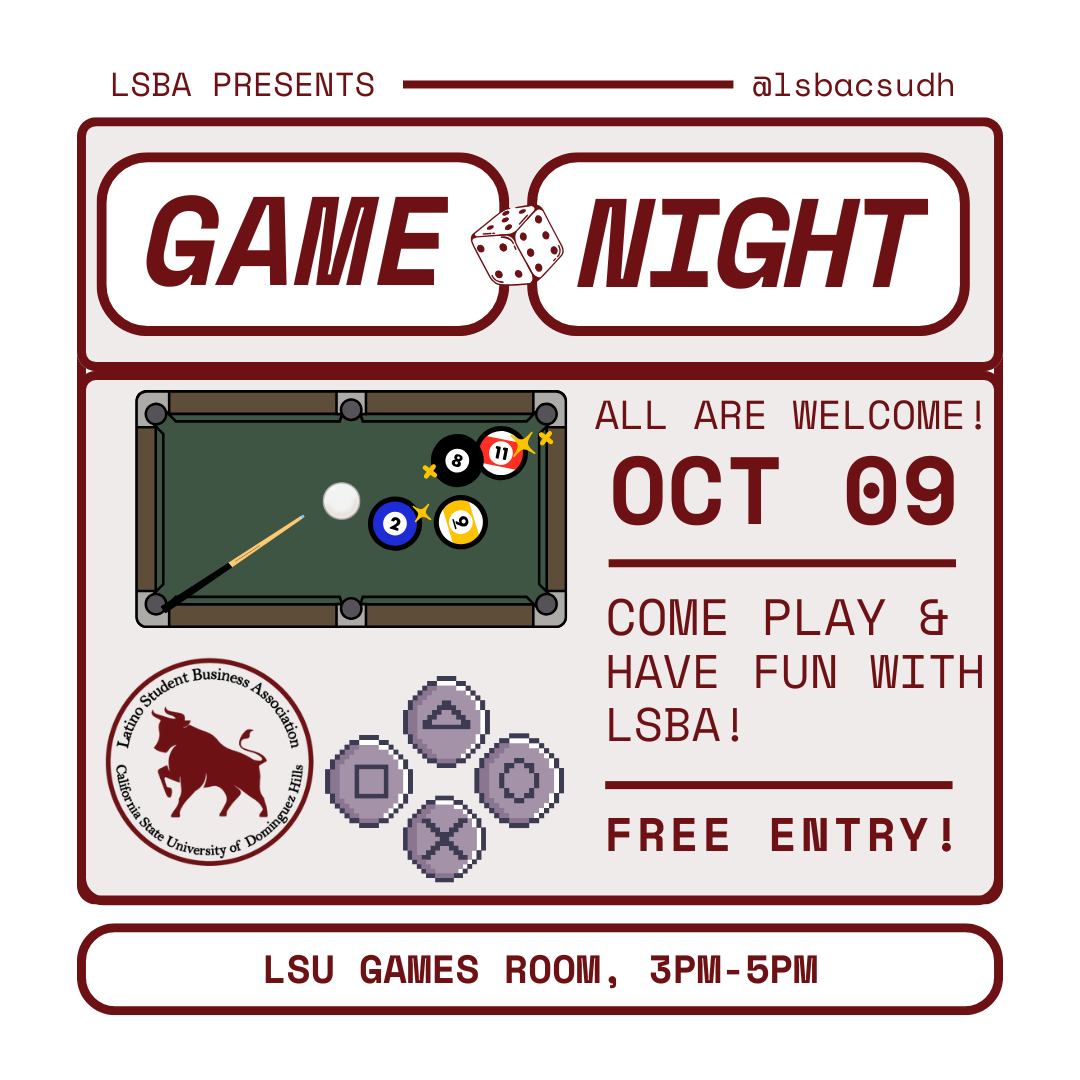 Come join us for some fun! 🎮🎱 Join us Thursday October 9th from 3pm-5pm for a time to relax and cool down in the LSU Games Room. We encourage you to Invite your amigo/a for a fun time!